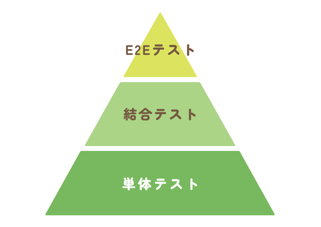 一般的な構成は、下層に単体テストを多く配置し、中層に結合テスト、上層に少数のE2Eテストを配置する形です。